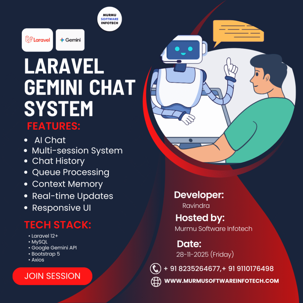 At Murmu Software Infotech, we are excited to introduce our Laravel Gemini Chat System โ a powerful, intelligent, and scalable chat solution designed to provide real-time and context-aware conversations.